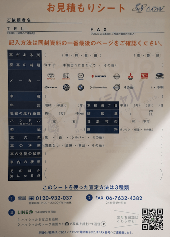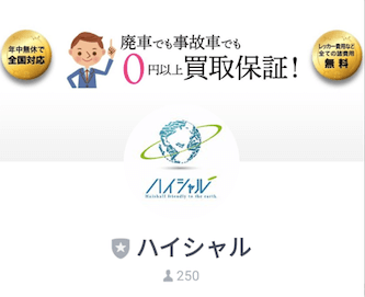 LINE査定の受付もしています。数ある廃車買取サービスの中でLINE査定を最初に導入したのがハイシャルです。