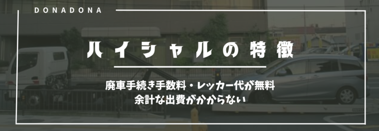 ハイシャルでは、廃車手続きが無料、指定した場所までレッカー引き取りも無料で来てくれます。