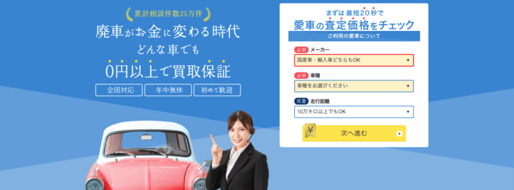 低年式車や、過走行車、故障車などどんな車でも0円以上の買取保証がついている廃車買取業者です。廃車手続きの手数料や、レッカー代も無料ですので、こちらが損をすることはないと考えておいて良いです。